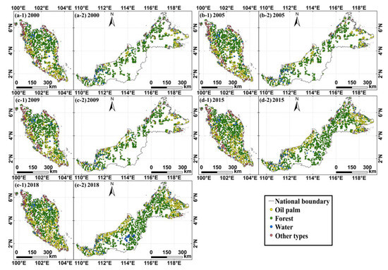According to our classification results, from 2000 to 2018, the oil palm plantation area in Malaysia increased from 5.59 to 11.56 Mha—an increase of 5.98 Mha with a growth rate of 106.96%. The area of oil palm plantations in West Malaysia increased by 2.53 Mha, with a growth rate of 82.77%; in East Malaysia the area increased by 3.45 Mha, with a growth rate of 136.14%. The oil palm planting distribution during 2000–2018 is shown in Figure 5.