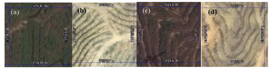 High-definition images with similar characteristics: (a,b) oil palm ground; (c) woodland; and (d) bare ground.