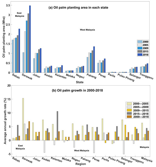 Oil palm planting area in (a) each state and (b) annual growth rate of oil palm planting during 2000–2018.