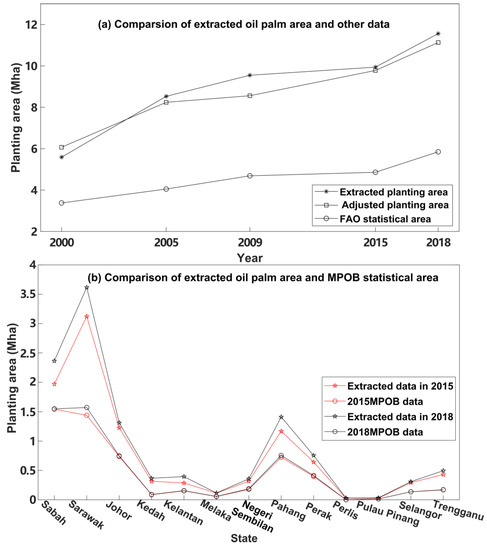Comparison of the extracted oil palm area with the statistical areas of (a) the Food and Agriculture Organization (FAO) and (b) the Malaysia Palm Oil Board (MPOB).