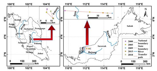 From 2000 to 2018, the oil palm planting area in Malaysia increased, but the movement of the planting center of gravity was limited, and the center of gravity was always located near a river. East Malaysia’s planting center of gravity was the farthest from the Bajang River in 2009, at approximately 40 km. The oil palm planting area of West Malaysia was largely filled in the expansion process. East Malaysia’s oil palms are distributed near rivers, oil palm land cover ranges from plains to a gently sloped area; as such, the expansion rate of the East Malaysia planting area was higher than that of West Malaysia. The transfer distance of the oil palm planting center of gravity for East Malaysia was also longer than that of West Malaysia. In the process of oil palm expansion, three patterns were found: (i) from a fragmented pattern to a connected area, (ii) expansion along a river, and, and (iii) from a plain to a gently sloped area. West Malaysia was dominated by pattern (i), while East Malaysia was dominated by patterns (ii) and (iii).