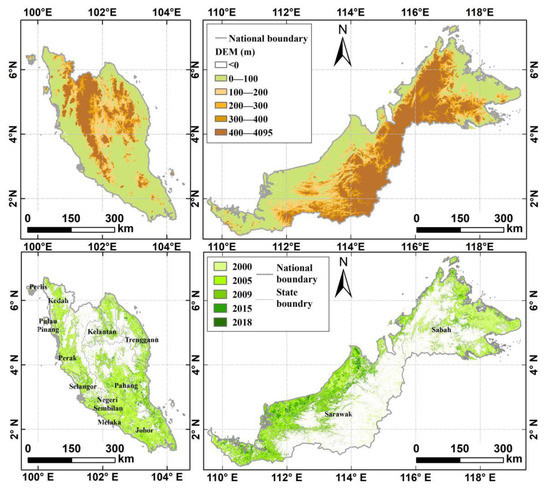 In addition to remote sensing data and elevation data, this study also combined spatial data, such as Malaysian administrative boundaries, and statistical information, such as the Malaysian statistical yearbook. Malaysia’s national administrative border and state administrative boundaries were derived from the Office of the American Geographer. The land area of the states of Malaysia and the oil palm planting area data during 2000–2018 were derived from the FAO and the MPOB. The price of crude palm oil during 1998–2018 came from the Malaysian Bureau of Statistics.