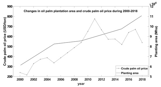 The planting area of oil palms is affected by various social factors, such as political, economic, and social development levels. The formulation of policies is generally influenced by economic factors, and the level of social development is also reflected in the economic situation. Therefore, this study selected the price of crude palm oil in 2000–2018 to represent the economic development of the oil palm industry and to reflect the impact of socioeconomic factors on the oil palm planting area.