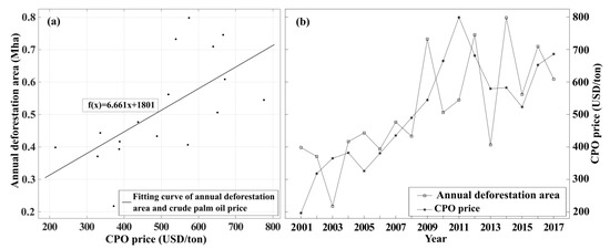 Relationship between forest loss area and CPO price in Malaysia during 2001–2017. (a) The fitting curve of the price of crude palm oil and the average annual deforestation area and (b) the curve of deforestation area and the price of CPO in 2001–2017.