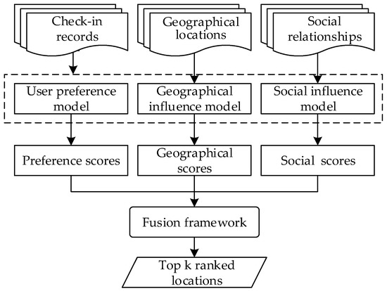 In recent years, wireless communication network technology, handheld devices, and location technology have developed rapidly. Many location-based social networks (LBSNs) services are widely used, such as Foursquare and Gowalla. In LBSNs, when people visit or check in at a place, their locations and check-in information are shared with other people [1]. These historical check-in data in LBSNs contain abundant knowledge about users’ interests and locations, which can help people discover places of interest and form new social connections [2,3,4]. Therefore, these check-in data are beneficial in a wide range of applications, such as location recommendation [5,6], event recommendation [7], and friend recommendation [8,9]. Location recommendation based on LBSNs plays an important role in providing better location-based services.