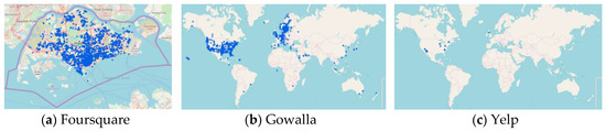 We used three publicly available real check-in datasets, which were crawled from three location-based social networks (Gowalla, Foursquare, and Yelp). The Foursquare dataset is provided in [24]. The Gowalla and Yelp datasets are provided in [5]. These datasets have different scales for the size of entities (i.e., users and POIs) and geographical ranges. The statistics of the datasets after preprocessing are shown in Table 2. Figure 2 shows the distributions of the locations in the three datasets.