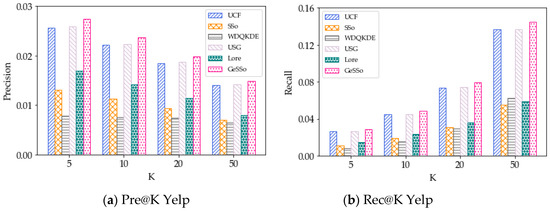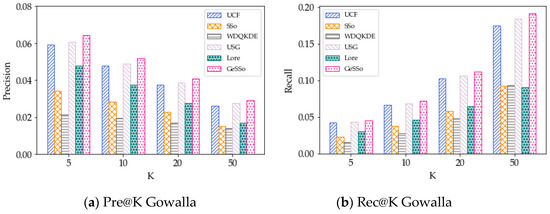Two widely used standard metrics, i.e., precision (Pre@K) and recall (Rec@K), are used to evaluate the quality of location recommendation models. For each user, the precision reflects the proportion of recovered locations to the K recommended locations, and the recall reflects the proportion of recovered locations to the locations actually visited in the testing dataset. The averages of the precision and recall of all users are reported in Equations (17) and (19), respectively, which are given by