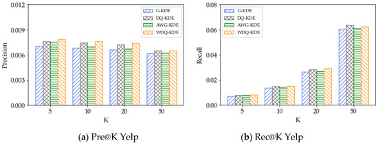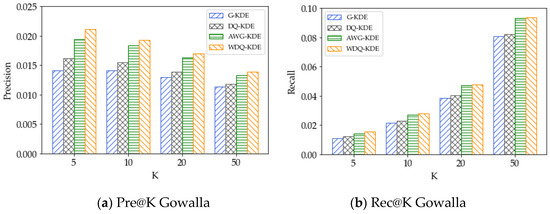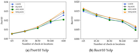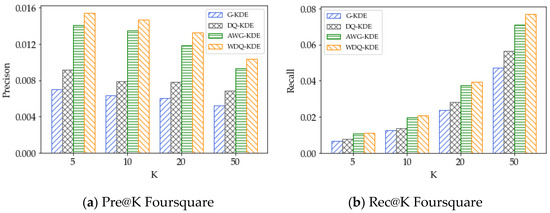 As we can see, as K increases, the precision decreases and the recall increases. This is because more recommended locations for users can include more locations that users would like to check in at as well as more locations that are less likely to be visited by users. Among the four geographical models, WDQ-KDE performs the best, and AWG-KDE and WDQ-KDE perform much better than G-KDE and DQ-KDE on the Foursquare and Gowalla datasets. However, WDQ-KDE and DQ-KDE have better performance than AWG-KDE and G-KDE on the Yelp dataset. This is because the locations of the Yelp dataset are widely distributed in several cities around the world, and performance usually suffers because of the existing outliers.