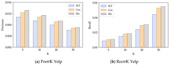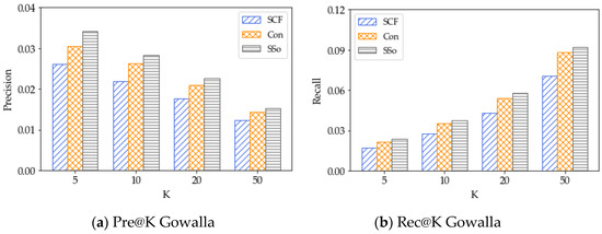 The model described in Equation (13) is denoted SSo. Figure 8 and Figure 9 depict the recommendation accuracy of SCF, Con, and SSo on two large-scale real datasets, i.e., Gowalla and Yelp. SSo fuses social closeness and connection. We model the factor of social closeness in Equation (11), i.e., SCF, and the influence of connection in Equation (12), i.e., Con. Note that the Foursquare dataset does not have social information, and therefore, we only report the results on Gowalla and Yelp.