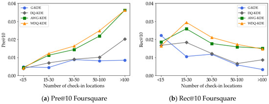 Figure 10, Figure 11 and Figure 12 show the recommendation accuracy of geographical recommendation methods regarding various numbers of check-in locations of users. The numbers of check-in locations are divided into five groups. As the number increases, users visit more locations. Users who visit more locations are called “active users”. As users visit more locations, the precision increases; this is because more check-in data are available for these recommendation methods. The methods will more accurately estimate the scores of these active users for new locations. However, the recall fluctuates as the visit number increases. The reason is that users who have visited many locations have usually visited many locations in the testing dataset. As a whole, WDQ-KDE performs better than the other methods on the three datasets.