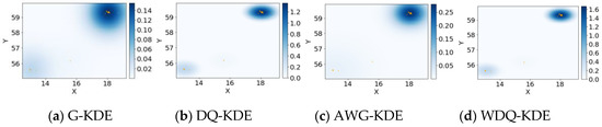 To detect the effects of the bandwidth and kernel function on location recommendation, we randomly select a user in the Foursquare and Gowalla dataset, respectively. Figure 13 and Figure 14 depict the density distribution of different kernel density estimation models. The horizontal axis represents longitude and the vertical axis represents latitude. The orange points in Figure 13 and Figure 14 indicate the locations that users have visited. According to Equation (7), the kernel density value in a certain place represents the score of the location. We use various shades of blue to represent the kernel density value, i.e., location score. The darker the color is, the higher the density.
