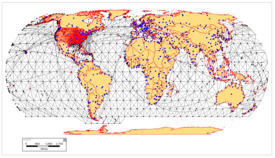 The NDC database contains detailed U.S. coasts ports, routes, and inland waterways, but limited information on the global maritime network. FAF database contains networks mostly for U.S. highways. However, the global maritime network by Oak Ridge National Laboratory (ORNL) [31] is complete with existing ocean routes for both the United States and the world and a grid mash covering all oceans for possible new or more optimal maritime routes. The ORNL network also contains U.S. domestic highway, rail, and inland water networks, and intermodal points. Figure 1 depicts a complete global maritime network containing grid and actual routes (in grey), 4000 + ports (in blue), and 250 + countries (in orange). This network is the outcome of combined NDC and ORNL networks and can only be used for assignment after further combining with WPI for port locations and freight flow information, which is primarily from the Schedule K in MARAD. The combination also involved some GIS data cleaning and processes, such as network routes alignment and ports.