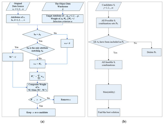In essence, the LP model in Equations (3)–(6) (Figure 2b) selects the desired attributes from all candidate source databases and forms the target database when the utility-based objective function value is maximized or optimized. The detailed operational steps for the LP model can be seen in Wang et al. [23].