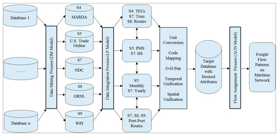 In this study, we concisely reviewed publicly available import and export databases for U.S. and the world maritime freight; developed an integrated model consisting of data mining (DM), linear programming (LP), and AON transportation assignment models through integration of software packages, including ArcGIS, TransCAD, and Google Earth; and visualized the U.S. global maritime import and export freight flows. This integrated model provides an alternative yet novel method to capture and highlight U.S. maritime trade patterns. The source databases were identified and selected from various public agencies, and the target database with desired attributes was obtained through using data mining and integration. Important issues, such as spatial scales, measurement units, conversions, code matches, and data manipulations, were discussed. Overall, we focused more on integration and result visualization than Shen [24,25], who emphasized data mining and processing.