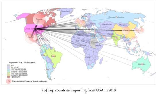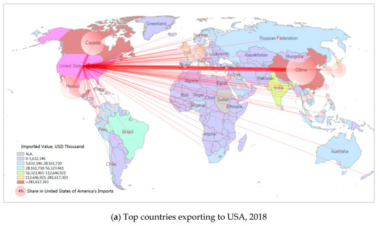 Figure 4a,b shows the U.S.’s top import and export trading partners in 2018. In Asia, the top three were China, Japan, and South Korea. Canada and Mexico were the top two in North America. In Europe, the United Kingdom, Netherland, Spain, Italy, and Belgium were major traders. In South America, Venezuela, Columbia, and Brazil were the leading three. In the Middle East, Saudi Arabia, Egypt, and Iraq were the leading partners. China, Japan, Canada, Mexico, and Venezuela were the top countries with large international trades with the U.S. during the period of 2008 to 2018.