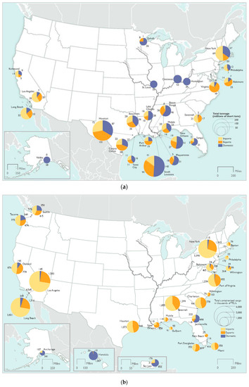 According to the U.S. Bureau of Transportation Statistics [7], the top 25 U.S. ports by total weight in tonnage and by TEU, including import, export, and domestic, are shown in Figure 5a,b. These top ports in Figure 4a handled two-thirds of U.S. import and export trade weight in 2017, including bulk freight, such as coal, petroleum, and grain. About 90% of U.S. import and export maritime TEUs in 2017 were shipped at these top ports (Figure 4b).