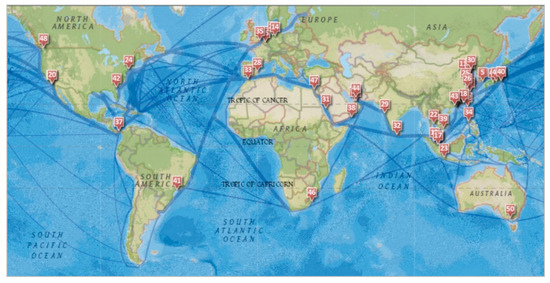 The 50 largest international ports in handling global container freight volume in TEUs are shown in Figure 6. These ports are located over six continents, in 200+ countries, and connect the world maritime shipping routes. They are highlighted in dark blue in the background of oceans, with route width representing flow volume [38]. Most of these ports are located in Asia, Southeast Asia in particular; the Middle East; and Europe. Africa only has one such top port [30]. Please note that the maritime network containing dark blue lines connecting the top ports and other smaller ports does not really exist. It is just an abstract representation of likely corridor spaces that the majority of individual vessels may go through between ports. Refer to Section 5.3 for more discussions.