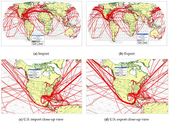 In this study, we aimed to estimate and visualize U.S. import and export shipments or freight flows on global maritime networks as proxies for U.S. international trade of goods during 2008–2018. This paper is structured as follows: Section 2 provides a concise review of relevant literature. Section 3 describes the necessary databases and their integration issues for U.S. maritime import–export freight and networks. Section 4 develops the integrated model framework, which contains DM (Data Mining), LP (Linear Programming), and AON (All or Nothing) sub-models and software integration issues. Section 5 presents key results and visualization of global freight flows between the U.S. and the world, including the largest ports in terms of handling goods by weight, value, and TEU; optimal flows on routes; and total or specific commodities in 2D or 3D graphics. A visual comparison of modeled optimal routes against real-time vessel density routes was conducted as a way of validating the model framework and its results.