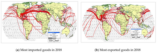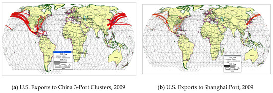 Figure 7, Figure 8 and Figure 9 depict optimal routing for U.S. exported and imported goods in 2009 or 2018; the total commodity for the world shown in Figure 6 and that for U.S. coastal ports is shown in Figure 7c,d. Specific commodities, such as most traded goods, are shown in Figure 8a,b. Finally, trade flows between specific country ports such as China and USA are illustrated in Figure 9a for U.S. exports to China’s three megaregion ports and in Figure 9b to the Shanghai port only in 2009. These selected maps provide snapshots of U.S. import and export freight flows with foreign ports at the world, country, port, and commodity levels.