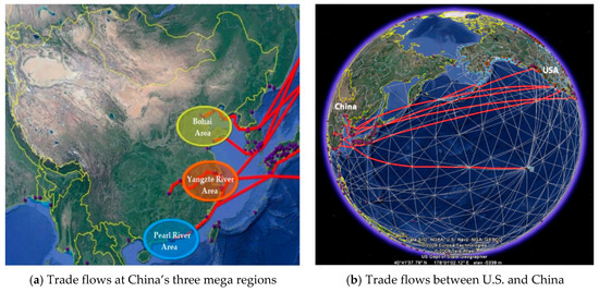 Global freight flows of U.S. international trade in 3D were implemented in Google Earth with optimal assignment results from TransCAD, and shown in Figure 9; the total U.S.–China imports and exports flows at China’s three major port clusters or mega regions in 2009 are shown in Figure 10a; and the total U.S.-China imports and exports flows over the Pacific Ocean, including Hawaii, are shown in Figure 10b. Note that the mash network for maritime freight flows was overlain onto the Google Earth to strengthen the visual 3D effects in Figure 9b. The red lines represent the optimal links and routes carrying freight flows between U.S. and China.