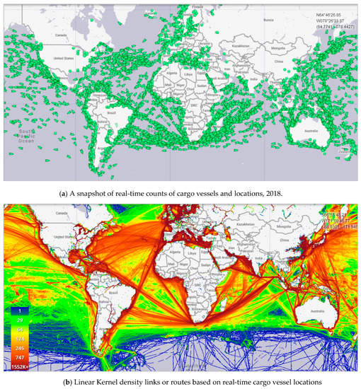 - Marine Traffic, Live Map, Real-Time Vessel Tracking and Density Map. Available online: https://www.marinetraffic.com/en/ais/home/centerx:-55.9/centery:-10.5/zoom:2 (accessed on 18 March 2020).