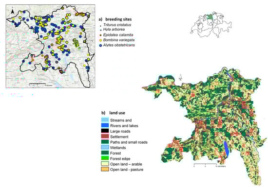(a) locations of observed breeding sites from within the last 10 years for each species. In total, there were 12 T. cristatus, 26 H. arborea, 45 E. calamita, 126 B. variegata, and 211 A. obstetricans breeding populations. The figure in the upper right shows the position of the canton of Argau within Switzerland. Basemap source: Esri, HERE, DeLorme, TomTom, Intermap, increment P Corp., GEBCO, USGS, FAO, NPS, NRCAN, GeoBase, IGN, Kadaster NL, Ordnance Survey, Esri Japan, METI, Esri China (Hong Kong), swisstopo, MapmyIndia, © OpenStreetMap contributors, and the GIS User Community; (b) land cover and land use data of the study region (Kanton Aargau) in raster format with a cell size of 10 m2.