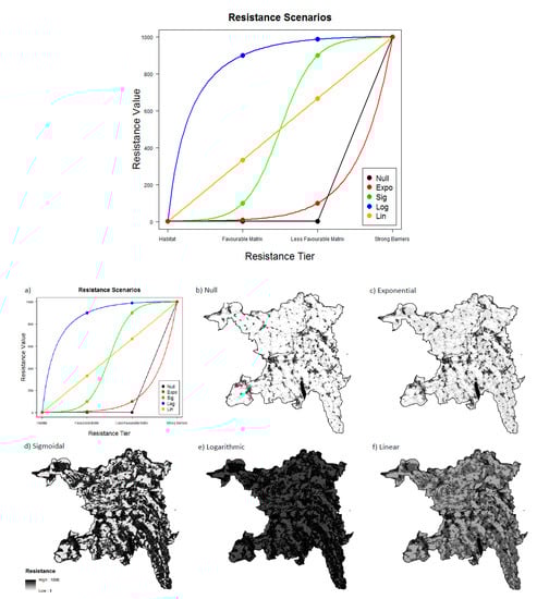 (a) the five theoretical resistance scenario transformations used to create the resistance maps; (b–f) show examples of the five resistance maps used in Circuitscape analyses for each species (seen here for A. obstetricans). Cells are shaded from white to black with increasing resistance. Each resistance map is derived by assigning one of the five resistance. scenarios from panel (a) to the habitat resistance rankings for each species in Table 1.