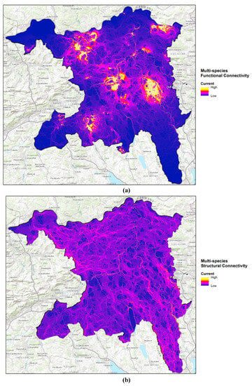 Regardless of the limitations of the models within this study, we believe that the methods outlined here to generate functional and species-specific structural connectivity maps could be very valuable to conservation efforts for these species and, if scaled up accordingly, for even more species and regions. Both sets of current maps, functional and structural, provide a great deal of information concerning landscape connectivity and could seemingly be used in a multitude of conservation-related applications. The functional connectivity current maps act as excellent visual aids that are easily accessible and intuitively allow a user to locate areas within each species’ distribution where connectivity is high or low on a cantonal scale. Focusing in on specific areas elucidates the importance of fine-scale features that can inform decisions in development and land use change, suggest locations along highways where amphibian tunnels may be needed, or identify sensitive movement corridors that could benefit from reinforcing protective measures. The structural connectivity maps can guide restoration efforts, highlighting suitable locations for the creation of stepping stone ponds between isolated clusters of breeding populations. In addition, such maps could provide decision-makers with the insight needed to mitigate the impact of development on biodiversity and identify regions where landscape connectivity can be improved. This feature is particularly relevant in the context of designing green infrastructure [9], a concept in spatial planning policy included in the EU2020 Biodiversity Strategy that involves the strategic planning of development and land use to ensure the long-term persistence of biodiversity and ecosystem services [9,59,60,61]; EEA (https://www.eea.europa.eu/themes/sustainability-transitions/urban-environment/urban-green-infrastructure/what-is-green-infrastructure).