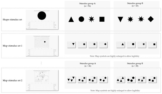 Between-subjects design applied for three stimulus sets. Screenshots of the survey are shown to the left, illustrating the stimulus materials as used in the surveys. Shape and map stimuli used in the study are illustrated to the right, according to the two between-subjects stimulus groups (A and B). Note that map symbols depicted to the right are highly enlarged to enhance legibility.