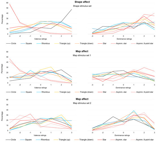 To further explore whether affective shape qualities persisted over the three different stimulus conditions (i.e., with and without cartographic context), the ratings of stimulus-triplets were compared. Stimulus-triplets, here, refer to those three stimuli which depicted the same shape type across the three stimulus conditions. Figure A1 (see Appendix A) contrasts the stimuli’s affective profiles of each stimulus-triplets graphically, concerning their qualities of valence and dominance.