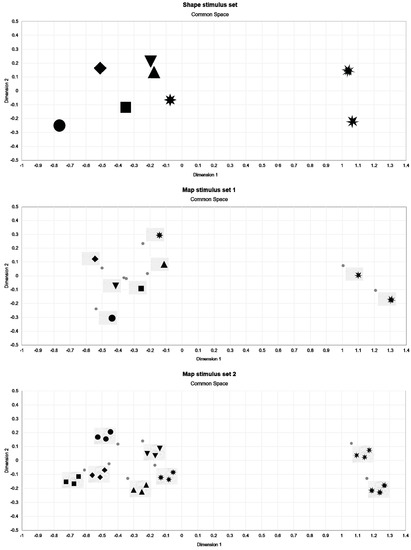 Figure 4 visualizes the result, illustrating the relational structure of each stimulus within its stimulus set (see Supplementary Material Table S12 for the coordinates of each stimulus by stimulus set). In the two-dimensional space, revealed similar stimuli were located proximal and dissimilar ones located distant to one another. Between all three stimulus conditions, MDS suggested two distinct stimulus clusters, i.e., one cluster of symmetric stimuli and one cluster of those stimuli depicting asymmetric star shapes. Hence, despite different cartographic and non-cartographic contexts, the overall relational structure between symmetric and asymmetric stimuli was found to prevail.