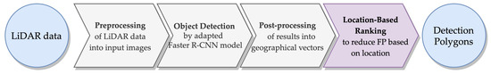 To explore the potential of R-CNNs for archaeological object detection in remotely sensed data, a workflow called WODAN1.0 (Workflow for Object Detection of Archaeology in the Netherlands [22]) has been developed as part of an ongoing PhD research in the Data Science Research Programme at the Faculty of Archaeology and the Leiden Centre of Data Science at Leiden University, the Netherlands. The workflow consists of three parts (Figure 1): (1) a preprocessing part that converts LiDAR data into input images; (2) an object detection part consisting of an adapted version of the Faster R-CNN model [25]; and (3) a post-processing part that converts the results of the prior step into geographical features, directly usable in a Geographic Information System (GIS).