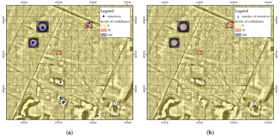 Excerpts of LiDAR data, visualized with Local Relief Model [40], showing: (a) the results of the post-processing step with points for individual barrow detections (blue) on the cells of the reference standard (with different levels of confidence); and (b) the results of the spatial aggregation showing the number of detections per cell (with different levels of confidence); (source of the height model: Reference [39]; coordinates in Amersfoort/RD New, EPSG: 28992).