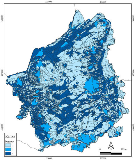 Based on the above, a three-tiered ranking map (Table 3 and Figure 5) for the research area was developed, using open-source geo(morph)ological and topographical data from the online spatial data repository PDOK [39]. The digital geological map (Bodemkaart van Nederland, scale 1:50.000) and geomorphological map (Geomorfologische Kaart van Nederland, scale 1:50.000) were used to determine the location of drift-sand areas, plaggen soils, and ‘badlands’ (e.g., dikes, quarries, etc.). The digital topographical map of the Netherlands (Basisregistratie Grootschalige Topografie) was used to demarcate built-up areas. Roads were extracted from the national road dataset (Nationaal Wegen Bestand). The following ranks were determined: