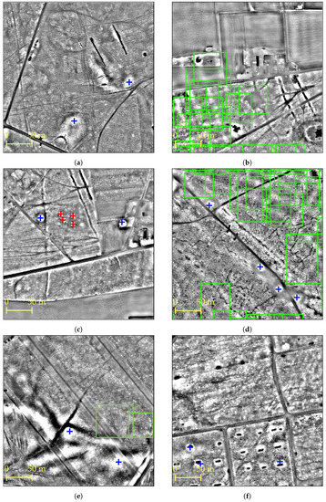 Excerpts of LiDAR data, visualized with Local Relief Model [40], showing correct (a–d) and incorrect (e,f) detections of barrows (blue), Celtic fields (green), and charcoal kilns (red) by WODAN2.0 (source of the height model: Reference [39]).