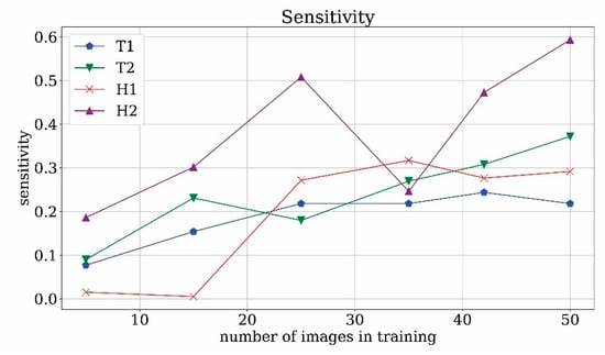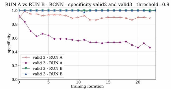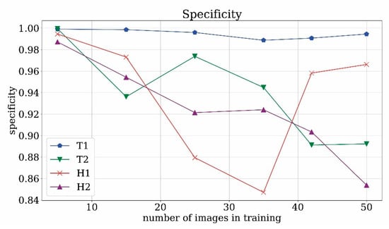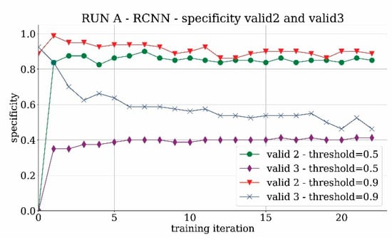 Considering a set of test images composed only of positive (negative) images, it is clear that TN = FP = 0 (TP = FN = 0) and the accuracy exactly corresponds to the sensitivity (specificity). As detailed in the next section, considering positive-only (or negative-only) sets is very useful during the network training and validation phase to evaluate different capabilities of the network.