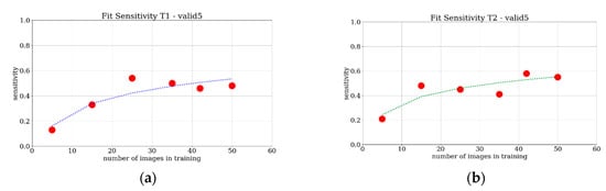 Real values (red dots) and fitting curves (dotted line) of sensitivity analysis: (a) for T1 with valid5 and threshold equal to 0.9; (b) for T2 with valid5 and threshold equal to 0.9.