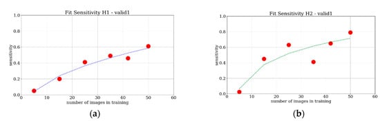 Real values (red dots) and fitting curves (dotted line) of sensitivity analysis: (a) for H1 with valid1 and threshold equal to 0.9; (b) for H2 with valid1 and threshold equal to 0.9.
