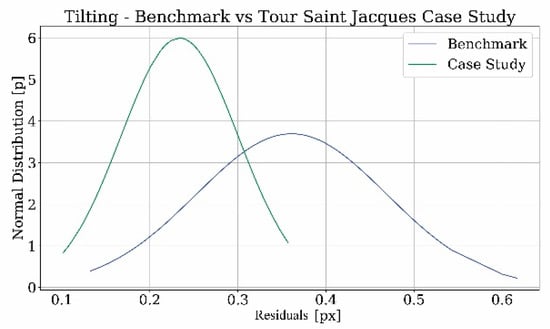 Comparison of normal distribution of the residual value between benchmark and case study considering the tilting camera motion for the Tour Saint Jacques.