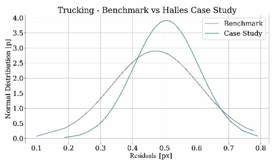 Comparison of normal distribution of the residual value between benchmark and case study considering the trucking camera motion for Les Halles.