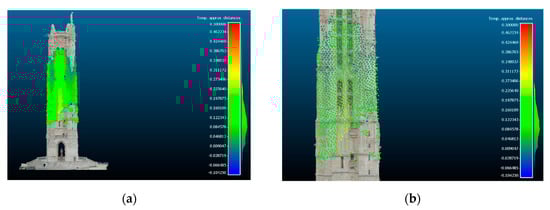 Distances comparison between the obtained point cloud and existing 3D model in (a) and a detail in (b).