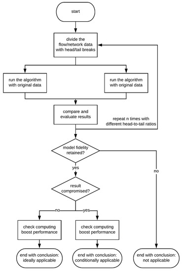 We design an evaluation framework to test the applicability of head/tail breaks to any flow analytics algorithm. As shown in Figure 2, the process begins with splitting the flow data into two parts with head/tail breaks. There are at least two options to set the breakpoint: based on a specific flow value (e.g., mean) or on a preset head-to-tail ratio. The next step is to run the algorithm with the original data and with the “head” part only, respectively. Then we record the computing time and algorithm results of each test and repeat the process with different head-to-tail ratios. Even though the main purpose of head/tail break data reduction is to boost the computational efficiency of the algorithm, the bottom line is that model fidelity has to be maintained, i.e., the algorithm ought to produce results that are fundamentally consistent with results generated on the original data. The actual way to carry out this step varies according to the type of algorithm. For instance, a clustering algorithm should retain a similar number of clusters, while a ranking algorithm should keep most ranks consistent. If it fails, the whole evaluation process ends with the conclusion that head/tail breaks do not apply innocuously to this particular algorithm, and it becomes meaningless to record the computing performance.