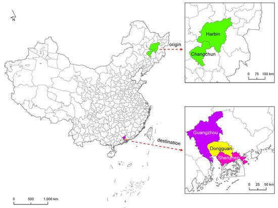We further examine the differences that head/tail breaks bring to the flowAMOEBA results, which might not be reflected in the quality index. The original result contains 28 flow clusters capturing 81,044 travelers, while the result after applying head/tail breaks at the 13:87 head-to-tail breakpoint contains 27 clusters that capture 81,072 travelers. Through careful comparison of the detail of these two sets of results, we find that the latter includes an additional flow that connects two separate flow clusters in the original result as one bigger cluster. As shown in Figure 5, the original result has two separate clusters between these two regions: Harbin-Changchun to Guangzhou, and Harbin-Changchun to Shenzhen. Instead, the result after applying the head/tail break includes an extra flow from Harbin to Dongguan. Because of the contiguity relationship, this extra flow helps merge the two separate clusters of the original solution as one. Therefore, the number of detected clusters decreases by one, and the total flow value of the clusters increases by 28, which is the value of the additional flow. A possible reason behind this change is that the flow from Harbin to Dongguan barely passes the threshold set by the head/tail breaks to qualify as a seed flow. The search-and-expand process starting from this flow can easily include the nearby flows of higher value and pass the significance test. On the contrary, this same flow is likely to join a cluster through a search-and-expand process that started from a low-value flow, which leaves the cluster a lower chance to pass the significance test.