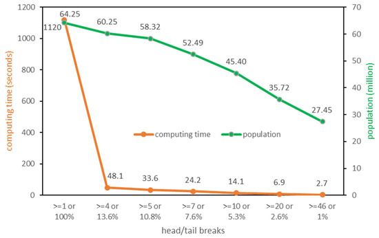Figure 6 summarizes the test results. The original computing time is 1120 s without applying head/tail breaks. It is decreased to 48.1 s by selecting the flows with value equal or larger than 4, or the top 13.6%, as input data. The computing time can be further shrunk with lower head-to-tail ratio. For instance, it would take less than half a minute to process only the top 1% as the input data.