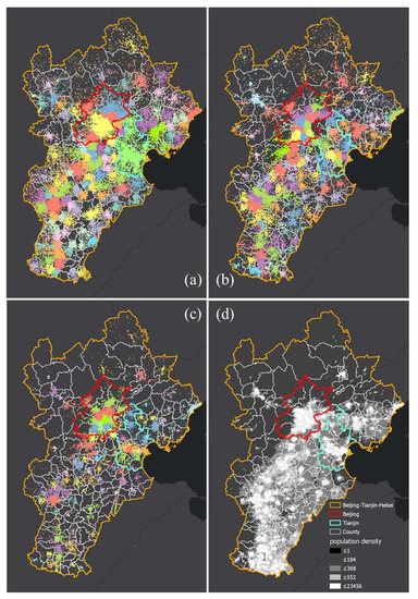 First, all the tests can extract at least a hundred unique communities at a granularity commensurate with counties. Most detected communities are consistent with the predefined county boundaries, with a few exceptions that are formed by multiple neighboring counties. Second, applying head/tail breaks to selectively reduce the input data would shrink the spatial extent of the retained communities within the BTH urban agglomeration. Comparing with the population density map in Figure 7d, we see that the shrunk communities preserve the most populous core regions, while losing the peripheral grid cells. Relating back to the chart in Figure 6, it can be concluded that the significant shrinking of communities’ spatial extent on the map does not lead to a proportional decrease of the population encompassed by these communities. In other words, the results obtained with head/tail breaks preserve the most meaningful parts of the community structures. Last but not least, head/tail breaks can help extract communities at lower hierarchical level. In Figure 7a, Beijing (with red outline) consists of a few communities and Tianjin (with turquoise outline) is detected as a single large community. By applying head/tail breaks, both megacities can be decomposed into a number of smaller communities that correspond to the city districts. This change probably results from the data reduction produced by the head/tail breaks that filter out the low-value flows that serve as the weak links between city districts. With only the “head” part as the input data, the algorithm is better positioned to extract the spatially compact communities with strong internal cohesion.