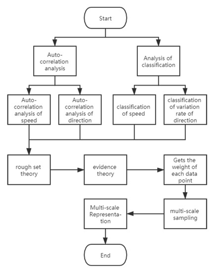 In order to satisfy the feature extraction of large vector fields and ensure the sampling accuracy of the data, this paper proposes a multi-scale representation method of ocean flow fields based on feature analysis. First, we performs an autocorrelation analysis and classification analysis based on rates of change in speed and direction across the data points in the flow field in order to calculate the weight of each data point with respect to each attribute and extracted feature area. Then, rough set theory is applied to determine the support of each attribute to the feature, and evidence theory is used to determine the weight combination of each attribute. Finally, the points are sampled according to this weight, which reflects how well they represent the flow field feature of interest. The method does not require complex mathematical calculations and uses more stringent conditions to thin out the data. The flow chart of the method is shown in Figure 1: