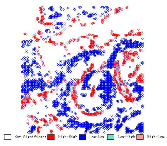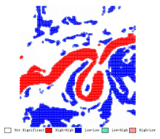 In Figure 4, the red region indicates high–high aggregation, the blue region indicates low–low aggregation, light blue indicates low–high aggregation, and light red indicates high–low aggregation.