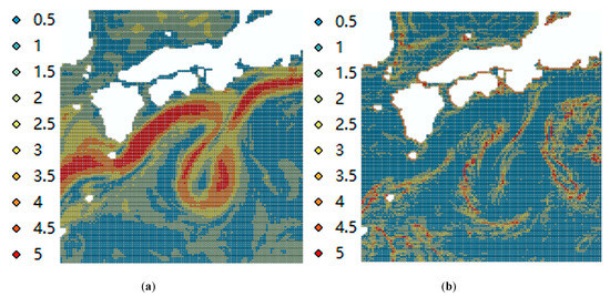 As can be seen from these maps, the weight sampling method shows some key characteristics of the Kuroshio current quite clearly, while they are somewhat less conspicuous on the map generated using the equidistant sampling method. The width of the Kuroshio, in reality, is wider than what is shown by the equidistant sampling method. This shows that the weight sampling method does a better job of preserving the flow field feature data than the equidistant sampling method.