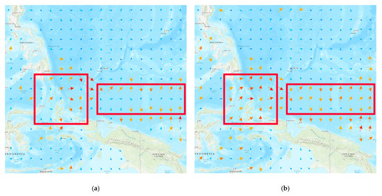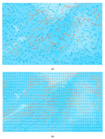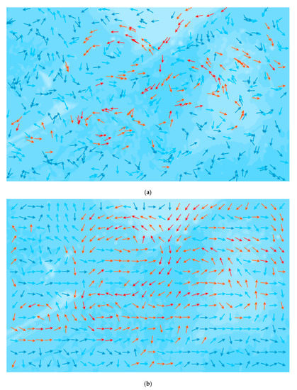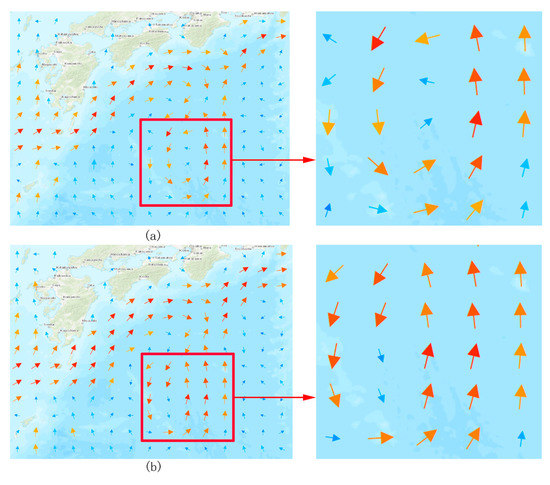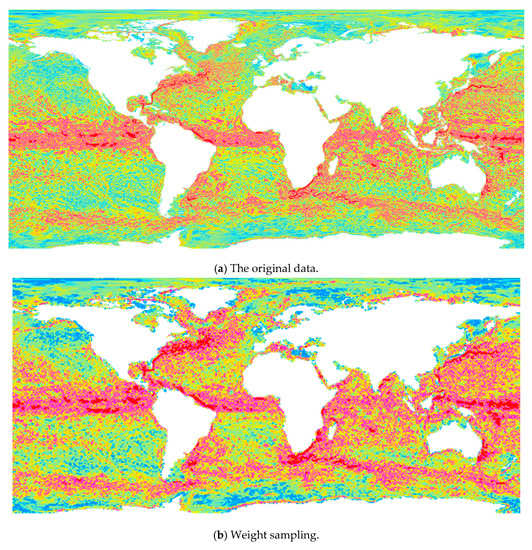 In Figure 15a is the global original resolution image, and in Figure 15b is the result of the weight sampling method. It can be seen from Figure 15 that the result of the weight method exaggerates the world ocean current compared with the original data, which can better solve the feature point loss of world ocean current caused by too large a step size.
