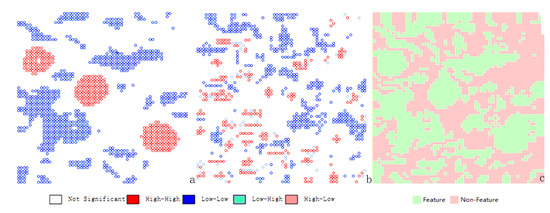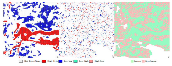 African data analysis(Resolution = 0.25). (a) Flow speed autocorrelation analysis, (b) Direction change rates of flow autocorrelation analysis, (c) Feature region and non-feature region, (a,b) are the results of autocorrelation analysis, which are divided into five types of data points: not significant, high-high, low-low, low-high, high-low. (c) is the classification map of feature regions and non-feature regions, which are used for the decision attribute of rough set theory.